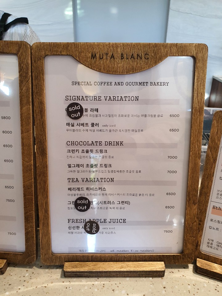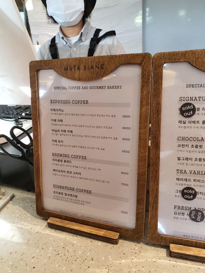 그런데 하나 간과한게 있다면 카페 부지가 넓다고 주문하는 곳에 사람이 없지는 않다는 겁니다... 오히려 연휴라 사람이 많아서 한참을 기다려야 했어요. 코로나 때문에 사람끼리 안 부딪히려고 무타블랑을 택했는데 이런 부작용이 있을줄은 몰랐습니다 ㅋㅋㅋ 메뉴판은 아래를 참고해주시구요.