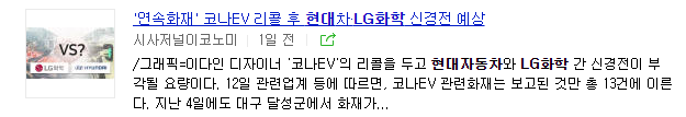 그나저나 현차는 저정도로 빠졌는데 옆에서 엄청나게 얻어 터지는 친구가 하나 있습니다. 현대자동차의 코나 배터리를 생산하는 LG화학인데요.