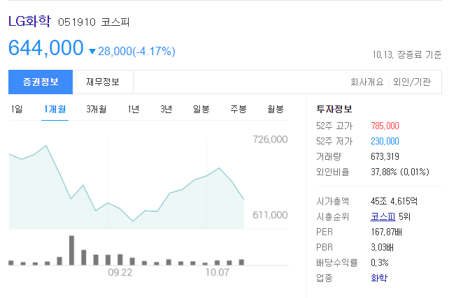 10월 13일 하루에만 4.17%가 하락하면서 예전 78만 5천원은 꿈에도 못 쳐다볼 64만 4천원을 기록 중입니다. 한 때 테슬라의 상승과 함께 23만원에서 78만 5천원까지 240%의 상승을 기록했던 LG화학은 1. 테슬라의 하락, 2. LG배터리 분사 이슈 등으로 주가가 계속 하락 중입니다.