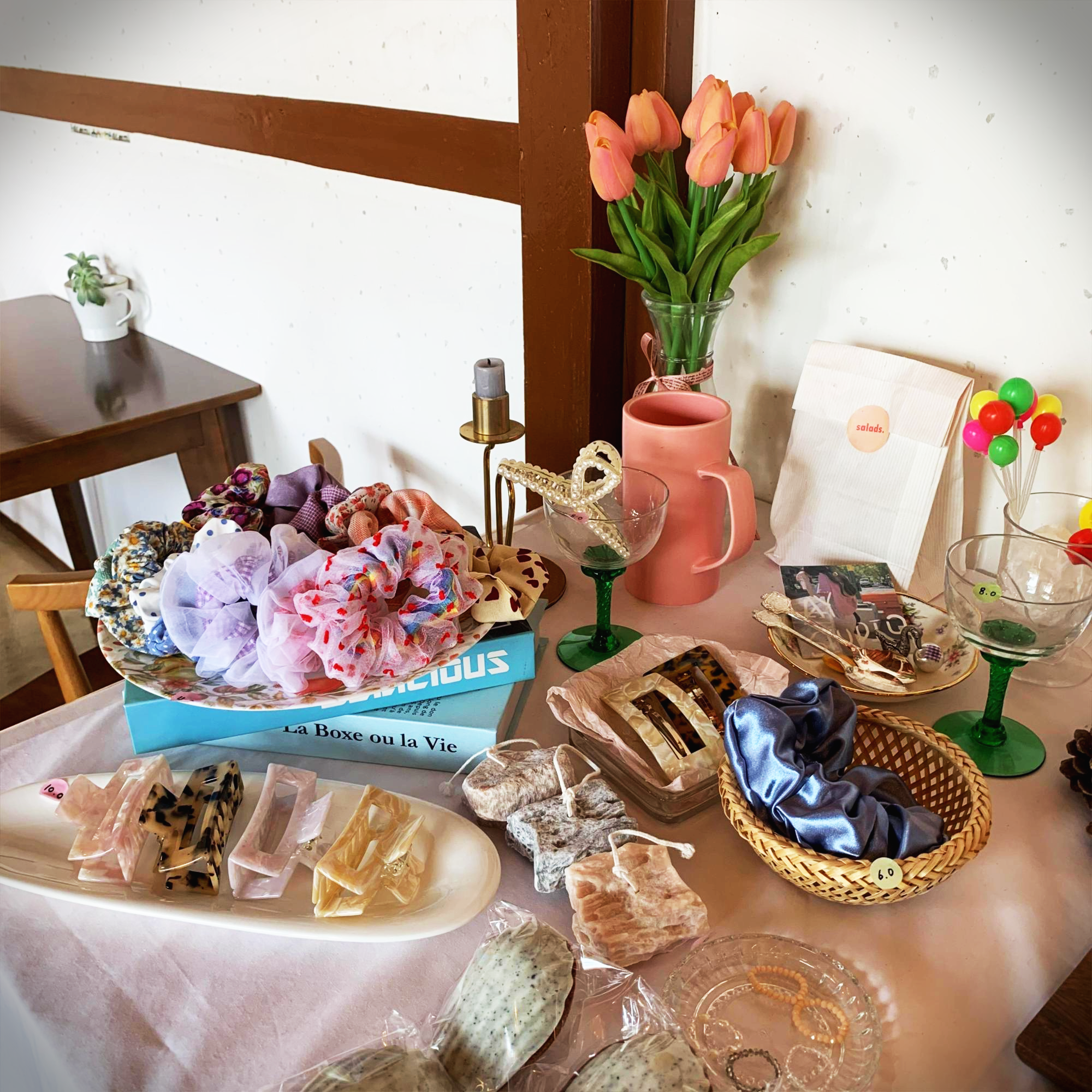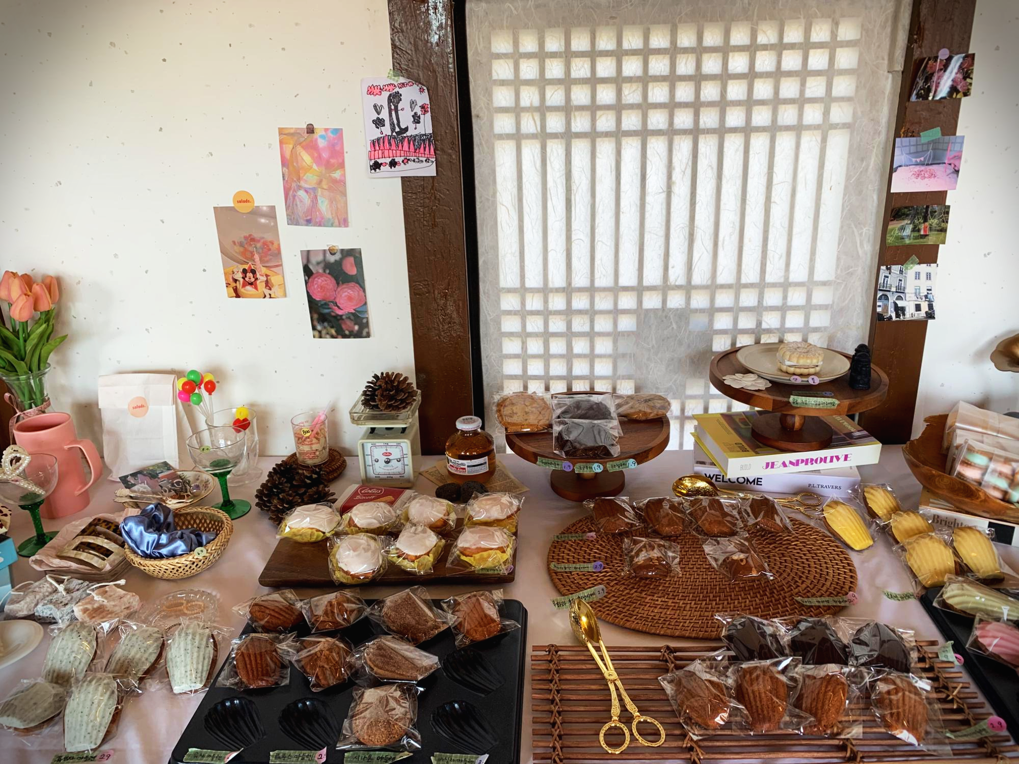 들어가니 빵을 파는 곳이 있었습니다. 저랑 와이프가 마들렌을 좋아해서 잘 됐다 싶었어요. 저는 유자마들렌, 와이프는 바닐라마들렌을 골랐습니다. 촉촉하니 아주 맛있었어요. 만약 은린 카페 방문하시면 마들렌 하나씩은 꼭 드셔보시길 추천합니다. 개인적으론 레몬케이크를 먹어보고 싶었는데 배가 이미 부른 상태라 못 먹어서 아쉽습니다. 빵 섹션 왼쪽에 장신구와 꽃 등이 있었는데 굉장히 예뻐서 한 컷 찍어봤습니다.