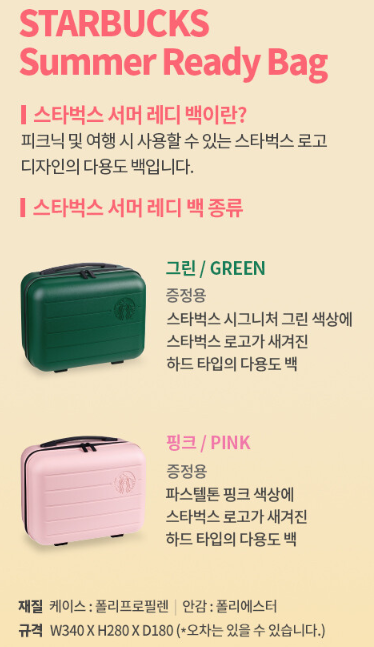 피크닉 및 여행 시 사용할 수 있는 스타벅스 로고 디자인의 다용도 백인데요, 그린 타입과 핑크 타입이 있습니다.