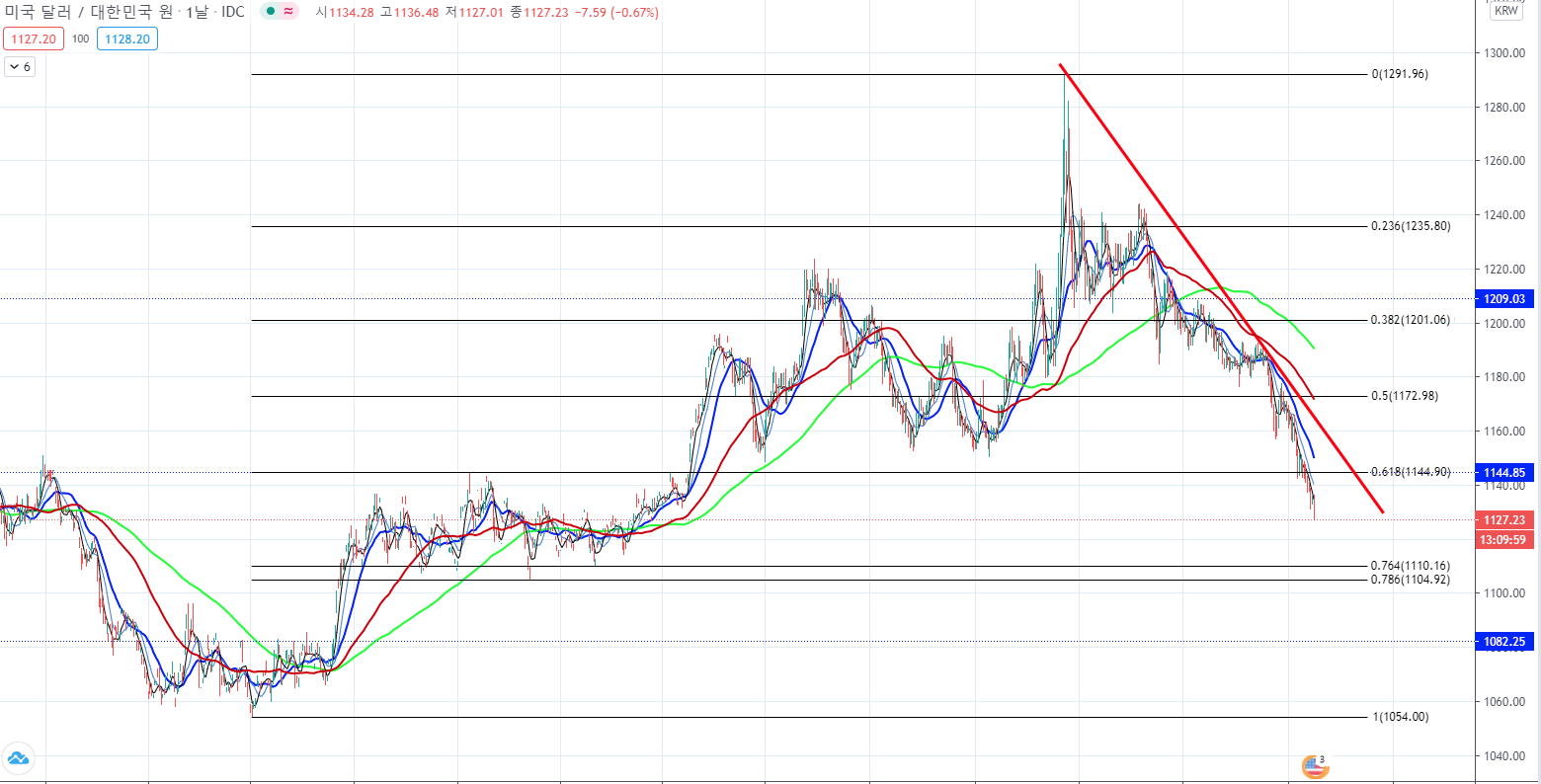 되돌림 분석의 기준은 최근 2년 동안에 가장 낮은 가격이었던 2018년 3월 29일의 1,054원과 코로나가 발생하고 나서 제일 높이 올라갔던 환율인 2020년 3월 18일의 1291.90원, 2개 기점을 기준으로 분석해보겠습니다. 가장 최근에 반등을 했던 지점은 0.618구간인 1,144.9원에 단기간 반등을 했지만 달러 약세화를 이기지 못하고 다시 하락을 하고 있는 중입니다. 이전에 다른 블로그에서 1,145원에 반등을 잠깐 하겠지만 다시 하락할 수도 있다라고 포스팅을 한 적이 있었는데 정말 그렇게 되었네요. 슬프게도요... 이미 가격은 1,127원을 지나고 있기 때문에 0.618 구간은 이미 물건너간 상태입니다.