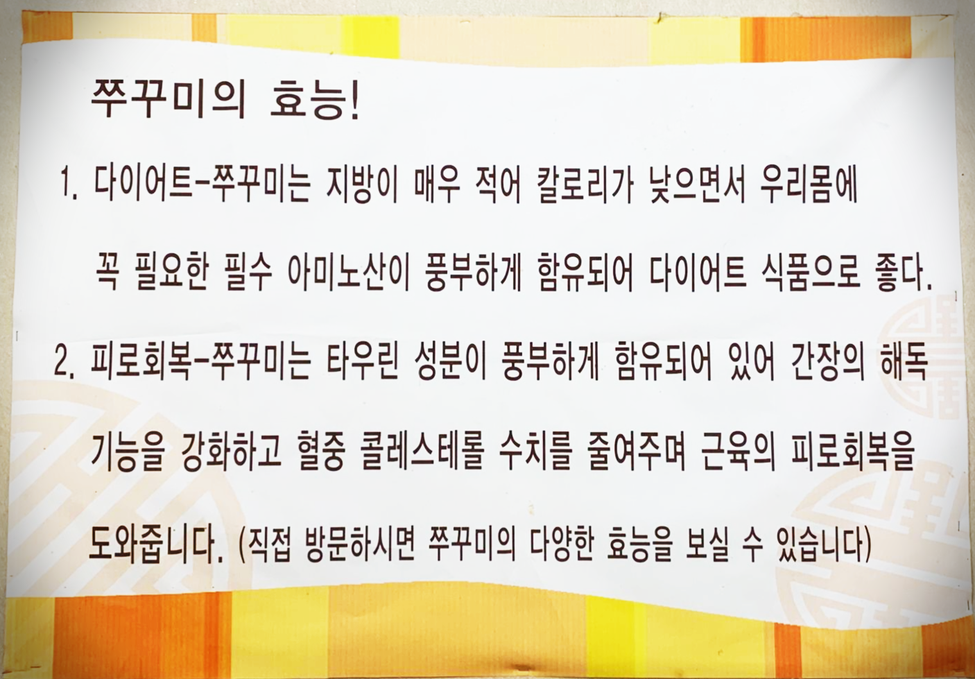 음... 문구를 그대로 써보자면 "다이어트-쭈꾸미는 지방이 매우 적어 칼로리가 낮으면서 우리 몸에 꼭 필요한 필수 아미노산이 풍부하게 함유되어 다이어트 식품으로 좋다." 라고 하는데... 그 다이어트에 좋은 쭈꾸미를 마요네즈에 엄청 찍어먹었네요. 저에겐 다이어트 효능은 없을 듯 합니다 ^^; 뭐, 맛있게 먹으면 0 칼로리라고 하니 그걸로 위안을 삼아야겠네요 허허.