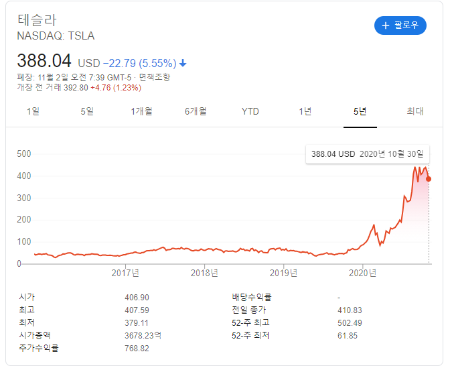 안녕하세요! 더블가리입니다. 20년에 테슬라는 전 지구상에서 가장 핫한 종목이었습니다. 미래 친환경, 전기차, 자율주행 등등 누구나 관심이 가고 입맛을 다실만한 미래 주도 섹터의 선두주자이자 아이콘이 되었으니까요. 게다가 적자에 허덕이던 과거와는 안녕을 고하고 이제는 흑자로 전환하여 미래의 자동차 및 자율주행 기술을 통해 돈을 쓸어담을 일만 남은 듯 했습니다. 그 기대감을 반영하듯 테슬라의 주가는 하늘 높은줄 모르고 고공비행을 하였습니다. 최근엔 조금 조정을 받고 있긴 하지만요. 그래도 40~80달러를 왔다갔다 하던 시절에 비하면 거의 10배의 수익을 안겨준 진정한 '텐베거'였습니다.
