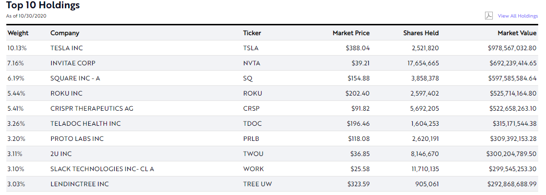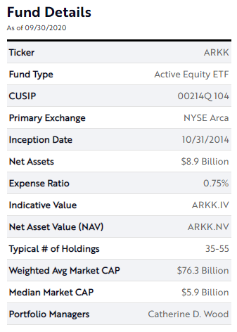 티커는 ARKK, 출시일은 2014년 10월 31일이니 신생펀드는 아닙니다. 현재 상장되어있는 곳은 Arca이며 보유기업수는 35~55개로 상당히 여러기업에 고루고루 투자하고 있음을 알 수 있습니다. 뭐 ETF니까 당연한 거겠지만요. ARKK의 순자산은 $8.9 Billion Dollar인데, 제가 6월말에 이 펀드를 봤었을 때가 $4.8 Billion Dollar였으니 몇 달만에 거진 2배가 올랐네요. 뭐 덕분에 저도 꽤나 수익을 보고 있어서 나름 빵긋입니다 흐흐. 다만 단점은 운용수수료가 0.75%라는게 걸리긴 합니다. 최근에 SPY ETF가 다른 ETF보다 수수료가 0.01% 비싸다는 이유로 금액이 몇 십조가 빠져나갔다는 소식을 들은 적 있는데 심지어 여긴 0.75%에요. ARK ETF들이 좀 수수료가 많이 비싼 감은 있습니다. 물론 연 15~20%씩 벌어다준다면야 0.75%는 새발의 피겠지요.