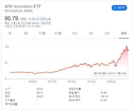 그렇다면 ARKK ETF의 주가는 어땠을까요? 20달러에서 시작하여 현재 90달러선에서 왔다갔다 했습니다. 106달러까지 찍고 오기도 했네요. 아직 텐베거 까진 아니어도 파이브베거정도는 달성했네요. 충분히 투자할 만한 실적인 것 같습니다.