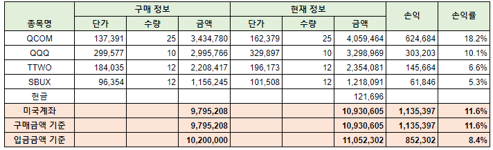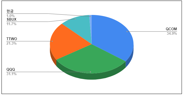 현재 종목별 비율은 앞서 말씀드린대로 퀄컴(QCOM)의 비율이 34.9%로 제일 큽니다. 다행인건 퀄컴만 쭉 오른게 아니라 다른 종목들도 상승을 해줘서 굳이 다음달에 리밸런싱을 안해도 될 것 같다는거죠. 당분간은 계좌를 건드리지 않고 어떻게 진행될지 살펴보도록 하겠습니다.