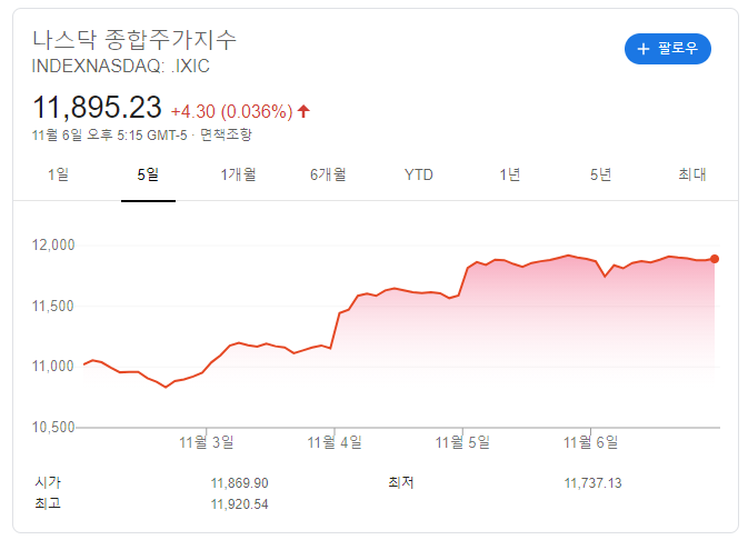 미국 대선의 마무리가 (거의) 지어지면서 불확실성이 해소되었다는 점이 미국 주식의 떡상을 불러왔습니다. 최근 환차손에 주가 하락까지 쌍싸다구를 맞던 미국 투자자들에게 실로 오랫만에 좋은 장이었습니다. 저같은 서학개미들의 마음고생이 이만저만이 아니었을 것 같은데, 이렇게 크게 반등이 나와주면 당분간은 추세 상승을 하지 않을까 생각해봅니다.