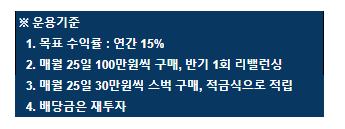 ▶ 매월 월급날에 투자를 진행합니다. 월급날은 매달 25일이지만 휴일여부에 따라 다를 수 있습니다. 100만원은 QQQ, 퀄컴 및 테이크투, 3개의 종목에 비율에 따라 매수를 진행합니다. 또한 30만원은 적립식으로 스타벅스 매수를 진행합니다. 모든 배당금은 재투자 및 주식 매수를 하는데 쓰이며 목표수익률은 연간 15%입니다.