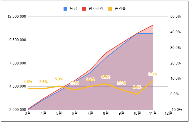 원래 그래프에 마이너스가 없었는데 10월에 잠깐 -0.3%까지도 찍었습니다. 미국 주식 시작하고 처음 계좌에 파란불이 찍혀서 살짝 놀랬지만, 역시나 미국은 미국이었습니다. 대선의 끝이 보이자마자 순식간에 어마어마한 상승을 보여주네요. 이 기세로 쭉 간다면 올해 목표인 15%를 달성할 수도 있지 않을까요?