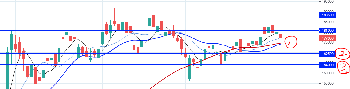 그렇다면 이제 현대자동차의 차트를 보면서 어느 금액대에 매수를 하는게 좋을지 한번 살펴보겠습니다. 아래는 현대자동차 주가 차트입니다. 18만 8천원과 16만원 사이에서 오르락 내리락 하고 있는 상황인데요. 정말 대형 악재가 터지는게 아닌 이상 15만원 아래로는 가지 않을 것 같습니다. 이미 여러 악재를 다 소화한게 지금 가격이니까요.