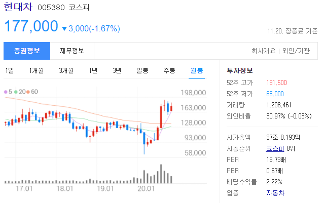 안녕하세요! 더블가리입니다. 요즘 코스피며 코스닥이며 주식시장이 꽤나 오르고 있습니다. 코스피도 전고점을 뚫네마네 하는 상황이며 코스닥이야 이미 바이오 및 진단키트의 파워로 쭉쭉 올랐다가 최근 조정을 받고 있습니다. 이렇게 주식시장이 활기가 도는데 유독 지지부진한 주식 하나가 있습니다. 바로 『현대자동차』 입니다. 우선 차트부터 보신 후 현대차는 투자할만한지, 어떤 방식으로 투자를 하는게 좋을지 등에 대해 얘기해보도록 하겠습니다.