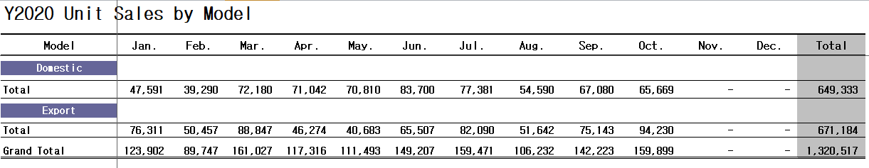 한국 국내 판매(domestic)이 견고하게 버텨주는 가운데 해외판매 대수는 4월에 반토막이 났다가 점점 회복하고 10월에 9만4천대까지 올라갔네요. 아마 코로나로 인해 몇 개월간 생산을 못하는 공장도 있었고, 아예 인도처럼 나라 전체가 락다운이 걸린 곳도 있어서 매출이 줄었지만, 소비 심리가 점점 회복되면서 원래 구매하려던 사람들이 다 같이 차를 사는게 아닌가 싶습니다. 그로 인해 해외 판매 대수가 쭉쭉 치고 올라간듯 하구요. 그렇다면 어느 정도 결론을 낼 수 있을것 같습니다.