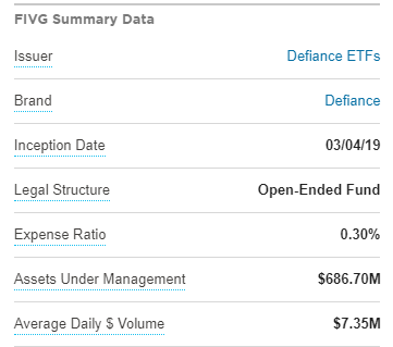 참 복잡한 구성으로 짜여진 ETF네요. 그럼 FIVG ETF의 개요를 한번 살펴보겠습니다. 생성일자는 19년 3월 4일이라, 이 ETF 역시 생성된지 얼마 안되었습니다. ETF 시가총액은 $686.7 M로 메인 ETF들에 비하면 시총은 작은 편입니다. 단점이 있다면 수수료가 0.3%로 좀 높은 수준입니다. 최근 수수료에 투자자들이 굉장히 민감해지다보니 운용사 별로 수수료 줄이기 전쟁 중인데, 과연 여기도 그 전쟁에 동참을 할진 의문입니다.