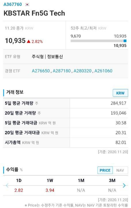 일평균 거래대금은 20~30억을 왔다갔다 하는 수준이라 사고팔고 하는데는 크게 문제가 없는 수준입니다. 시가총액은 82억인데 아직 설정 초기이기도 하며, 기존 5G ETF들의 시총과도 비슷한 금액입니다. 아직 생성된지 얼마 안된 종목이라 1달 기준 수익률도 표시가 안되는 상태네요. 현재 1주기준 4% 정도의 수익을 기록 중입니다.