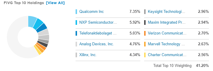 그렇다면 구성 종목을 살펴볼까요? 비중 1위는 제 주식들 중 비중 1위이기도 한 퀄컴입니다. 자랑스럽다 퀄컴 ㅠㅠ NXP는 예전에 삼성이 100조로 사는걸 고려했던 반도체 회사입니다. 그 외에도 에릭슨, 버라이즌, 차터 같은 글로벌 기업들이 눈에 띄네요.