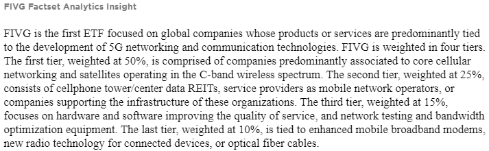 대충 해석하면 5G 네트워크와 통신기술의 발전에 투자하는 ETF인데 4개의 티어에 투자한다고 합니다. 첫번째 티어는 50%의 비중이며 기존 핸드폰 네트워크와 위성을 주도했던 기업들이며, 두번째 티어는 25% 비중으로 핸드폰 타워/센터 데이터 리츠, 모바일 네트워크 서비스 기업, 또는 저 기업들의 인프라 구성을 도와주는 기업으로 구성되어있습니다. 세번째 티어는 15% 비중이며 네트워크 서비스 하드웨어/소프트웨어 관련 회사로 구성되어있으며, 마지막으로 4번째 티어는 10% 비주잉며 모바일 광대역 모뎀, 광섬유 케이블 등의 발전에 기여하는 회사들도 구성되어 있습니다.