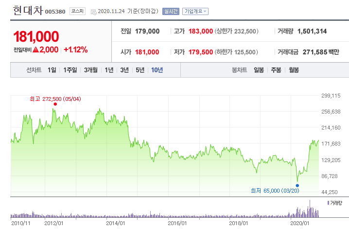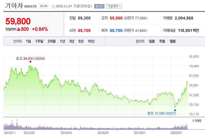 하지만 안타깝게도 2011년 말부터 전세계적인 경제침체와 유럽의 PIGS로 대표되는 국채만기 및 디폴트사태 덕분에 차화정의 시대가 저물고 말았습니다. 실제로 저 때의 고점을 아직 회복 못한 기업들이 많이 있습니다. 현대자동차같은 경우에는 2011년에 최고점인 27만원을 찍고 코로나사태 때 6만원대까지 간 적도 있으니까요. 기아차 역시 회복을 다 하지 못했습니다. 2011~12년에 최고점을 찍고 회복을 하지 못하고 있네요.
