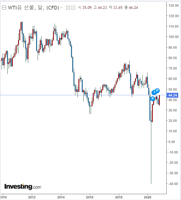정유주라고 크게 다르지 않습니다. 기름 선물가격이 -까지 떨어졌던 코로나 초기 시절에는 5만원까지 하락할 정도였습니다.