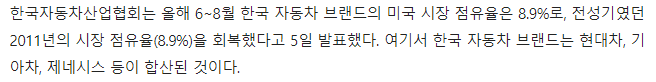 차화정의 '차'에 속하는 자동차 기업들은 어떤 기업들이었을까요? 바로 현대자동차, 현대모비스, 기아자동차 등이 있습니다. 현대자동차는 2009년 즈음에 미국에서 시장 점유율이 4%에 불과했었지만 2011년에 9%로 최고점을 찍었었습니다.