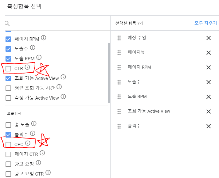 저 항목들 중 위에 있는 CTR과 아래 있는 CPC를 선택해주세요. 저것만 보고 싶으시면 다른 항목은 제외시키고 2개만 남기시면 보기 편합니다.