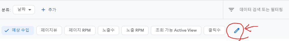 여러분들이 매일매일 확인하시는 애드센스 보고서 사이트에 들어가시면 위와 같은 메뉴가 있습니다. 사진에서 보이는 펜 모양을 클릭해주세요. 그럼 아래의 그림처럼 선택할 수 있는 항목이 쭉 나옵니다.