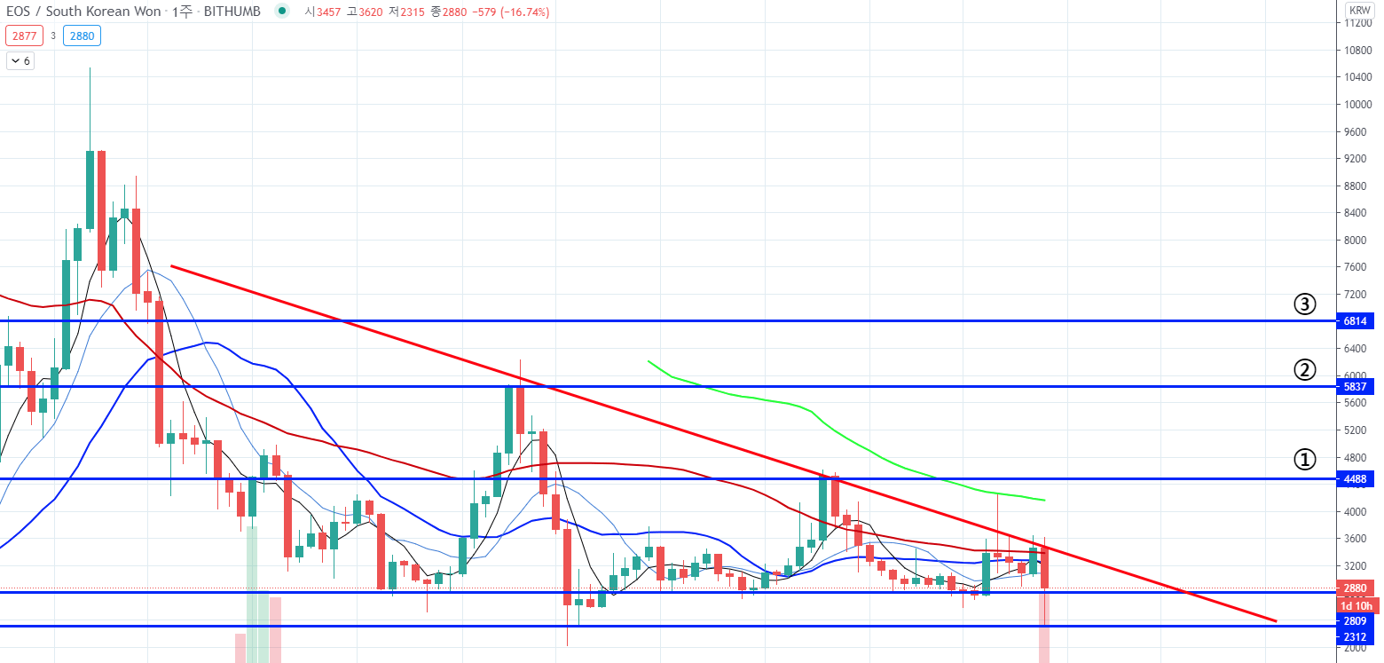 우선 트레이딩뷰 차트를 가져오다보니 모바일 화면에서는 좀 안 보일수도 있습니다. 미리 양해의 말씀을 드립니다. 이 차트는 이오스 주봉 차트입니다. 빨간색 선으로 표시해놓은 걸 보면 아시겠지만 저 라인을 뚫으려다가 실패하고, 뚫으려다가 실패하는걸 3번째 하고 있는걸 볼 수 있습니다. 코인 차트에 저런 모양이 유독 많은데 4번째 시도해서 뚫는 경우가 꽤 있습니다. 그래서 현재의 구간에서 조금 시간이 지나면 저 빨간선을 뚫고 나와 시세를 주지 않을까? 하는 생각인거죠.