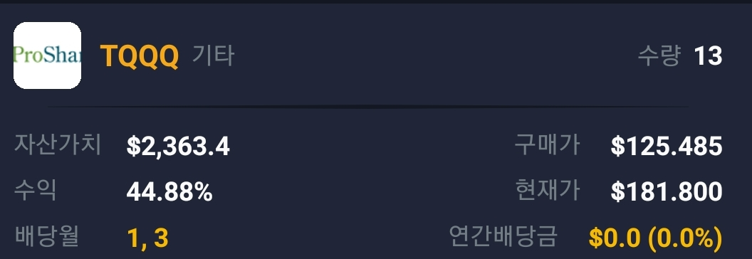 두번째는 QQQ 움직임의 3배를 추종하는 TQQQ입니다. 한국에선 2배짜리 레버리지도 난리를 피는데 이건 무려 3배짜립니다. 만약에 하루에 QQQ가 -33%가 된다면 TQQQ는 전부 휴지조각이 되버릴 수도 있는 무서운 주식이죠. 그래서 180만원 정도의 금액만 투자했고 현재 260만원 정도가 되었습니다.