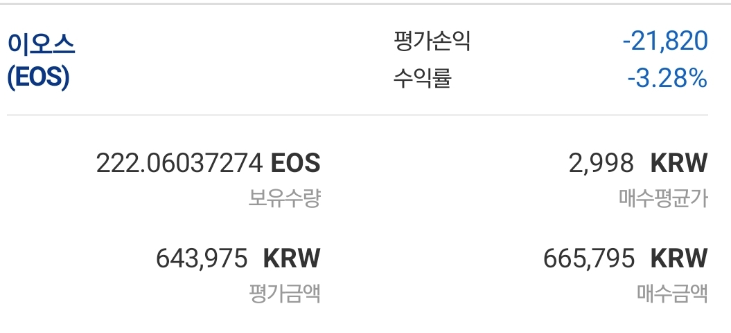 세번째는 가상화폐 코인인 이오스(EOS)입니다. 현재 -3%를 맞고 있군요 ㅋㅋ