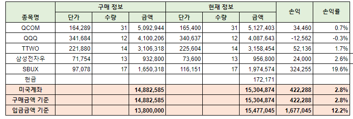 미국주식은 예전엔 매달 100만원씩 투자했으나, 현재는 기존 100만원 + 스타벅스 30만원 + 삼성전자우 100만원으로 매달 230만원씩 적립식 투자를 할 예정입니다. 20년 12월까지 1,380만원의 투자금이 들어갔고 21년까지 매달 똑같은 금액이 투자된다면 230만원 x 12개월 = 2,760만원이 추가투자 되겠네요. 그렇다면 투자 원금만 4,140만원이 될 겁니다. 물론 이건 투자 원금만의 이야기고 매년 목표인 15%의 수익률을 낼 수 있다면 1번 계좌는 대략 5천만원의 금액이 될 수 있을 겁니다.