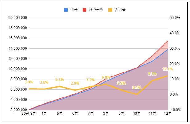2020년 월별 실적입니다. 처음 시작할 때 금액은 200만원에 수익률도 3%밖에 안됐었는데 어느덧 1,500만원에 12%의 수익률을 달성했습니다. 저게 원화 기준이라 그렇지 달러 기준으로는 20%의 수익입니다. 환차손 젠장..