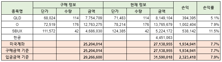 월별 실적입니다. 중간에 그래프가 움푹 들어가있는데 삼성전자우를 팔았을 때 입니다. 그 이후에 한국 가족계좌에서 수익이 꽤 나서 미국계좌로 천만원 정도 이동시켰더니 다시 올라온 상황이네요. 종목은 심플하게 3개로 줄였습니다. QQQ의 2배를 추종하는 QLD 50%, 현금의 역할을 하면서 배당도 월마다 나오는 리얼티인컴(O) 50%, 그리고 스타벅스는 별도로 매달 50만원씩으로 운용하려고 합니다. 당분간 테이퍼링 이슈다 뭐다라고 하는데 그냥 무지성으로 매달 일정금액 구매 방식으로 계속 가려고 합니다. 어차피 시장 이기는게 목적이 아니라, 스노우볼을 굴릴 금액을 만드는게 목표이니까요.
