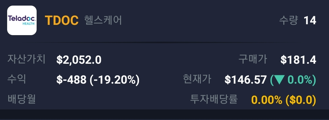 두번째는 텔라닥입니다. 헬스케어 관련 주식인데, 하락이 계속 있습니다. 좀 내려가면 사려고 현금을 계속 모아두는 중입니다. 개인적인 생각으론 헬스케어는 상승 막바지까지 계속 오를 수 있는 섹터라 생각하기 때문에 계속 모아가보겠습니다. 아직 현금 모아둔건 하나도 안 쓴 상태이니, 다음달 쯤에는 구매가가 많이 내려갈 수도 있겠네요.