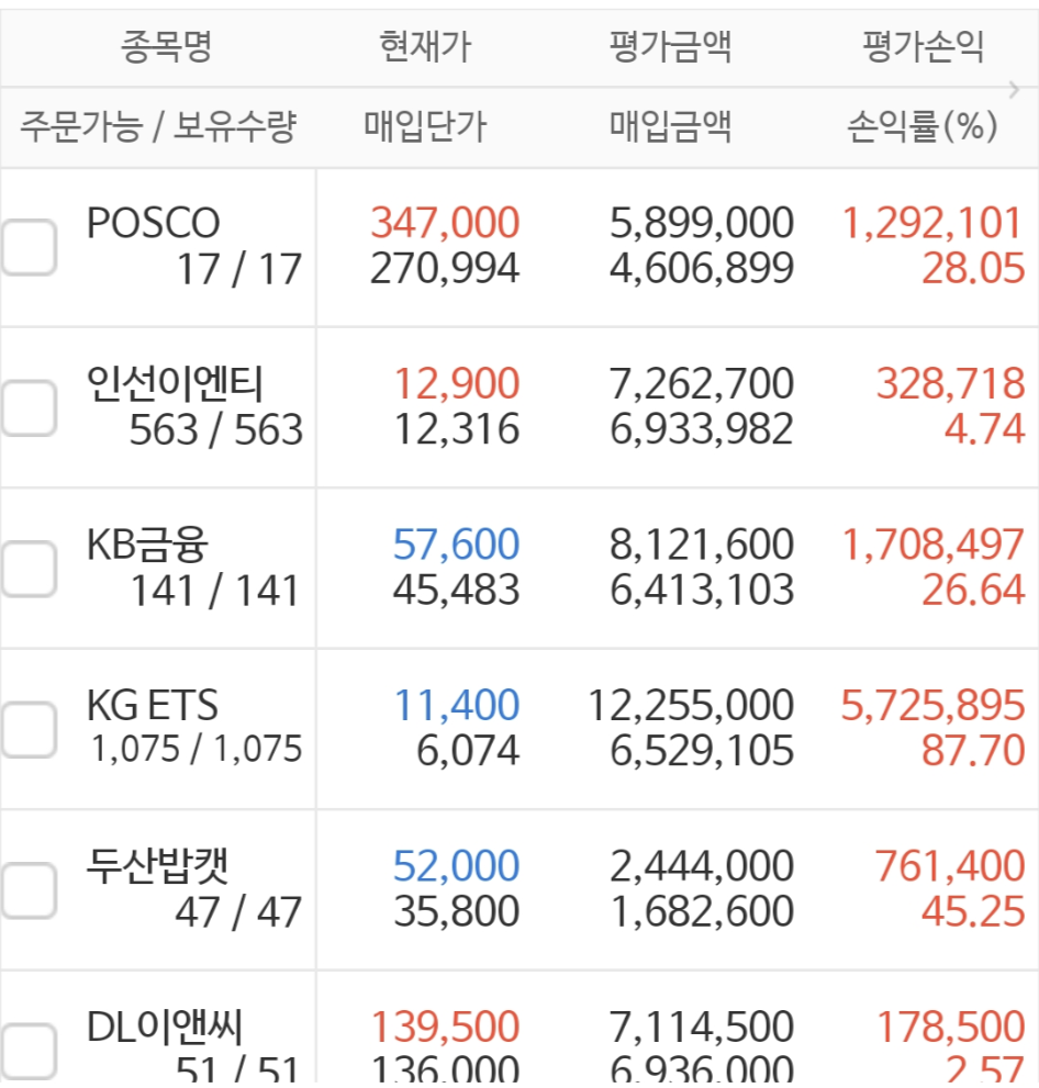수익이 마이너스 아닌가? 라고 하실 수 있을텐데, 미국계좌로 천만원, 전세계약 및 생활비로 900만원 정도 옮겨놓은 상태라 그렇습니다. 종목은 4월과 바뀐게 전혀 없습니다. KG ETS가 1분기 실적이 미친듯이 잘 나와서 거의 2배까지 올랐다가 지금은 잠시 주춤한 상태입니다. 만원은 넘길줄 알았는데 이렇게 금방 올 줄은 몰랐네요. 그 외에도 금융, 건설쪽에서 차분하게 올라주고 있습니다. 그리고 4,5월 합쳐서 배당이 거의 80만원 정도 들어왔더라구요. 6월의 반기 배당도 한번 기대해보겠습니다.