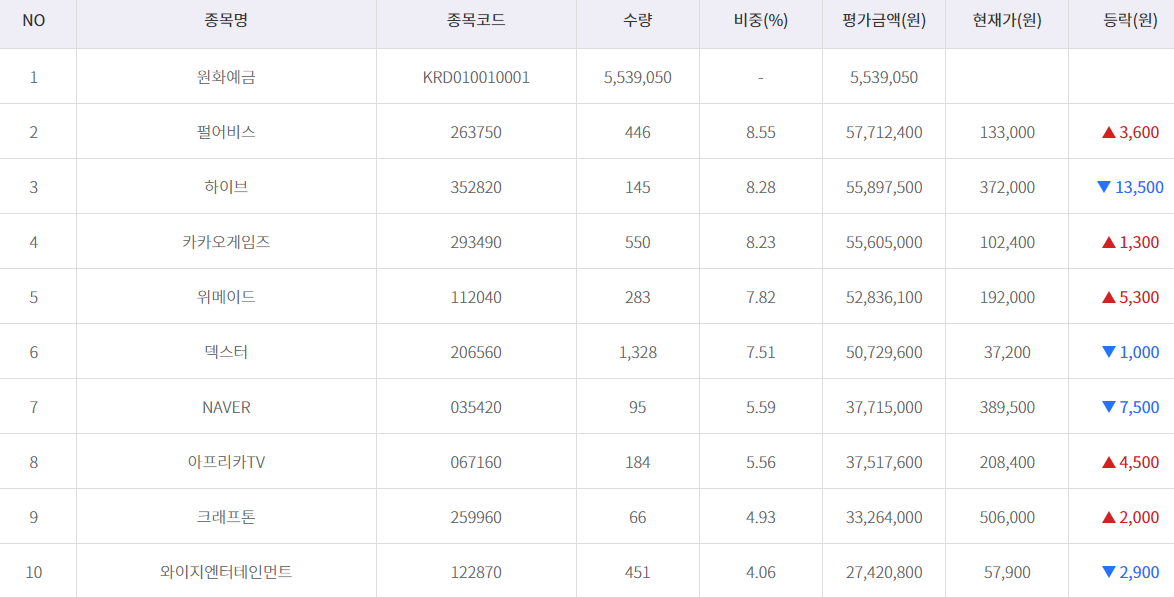 우선 설명에 적혀있는대로, 한국의 메타버스 관련 업체에만 투자하는 ETF입니다. 안타깝지만 로블록스, 앤비디아, 유니티 같은 해외 종목에는 투자하지 않습니다. 그렇다면 어떤 종목에 투자하는지 리스트를 보시죠.