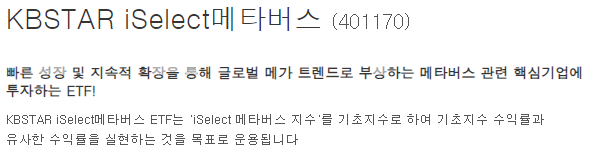 두번째는 KBSTAR iSelect 메타버스 ETF입니다. 이 ETF 역시 상장일이 2021년 10월 12일로 앞에 설명해드린 ETF와 거의 차이가 나지 않습니다. 아무래도 메타버스 자체가 새로운 개념이다보니 ETF로 꾸려서 나오는데 시간이 좀 걸렸을 것 같네요. 아래는 공식 홈페이지에 소개되어 있는 종목 설명입니다.